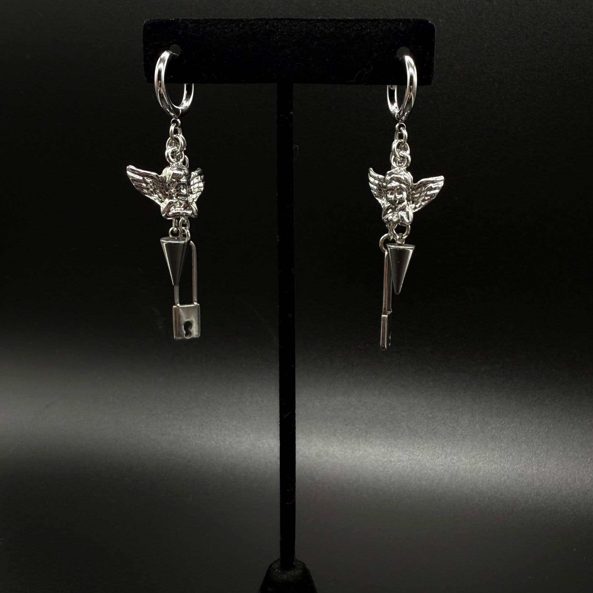 A cherub, spike, and lock on a pair of earrings