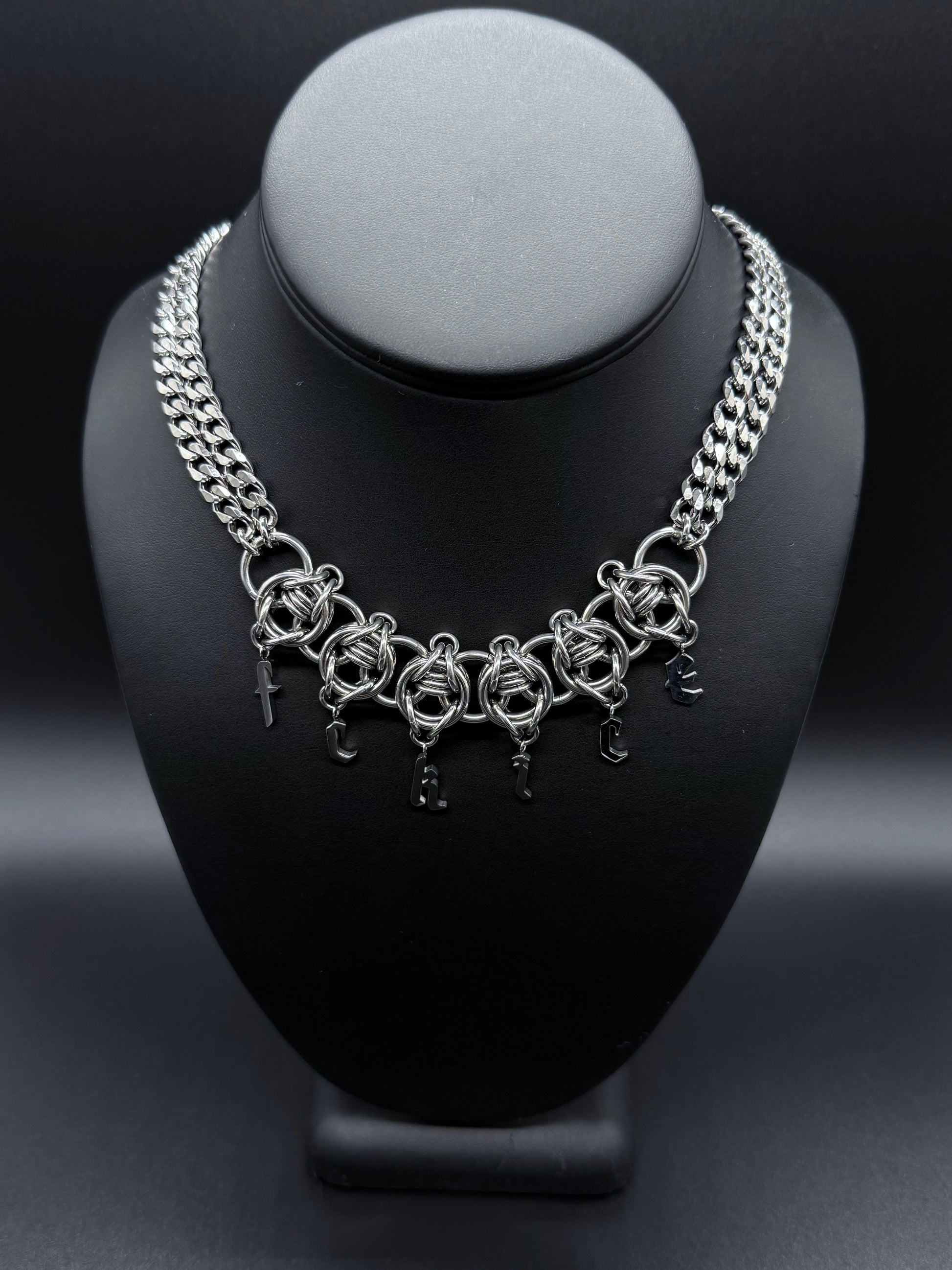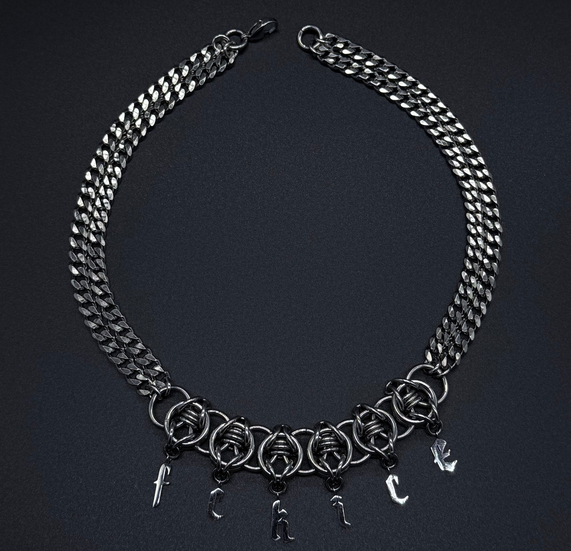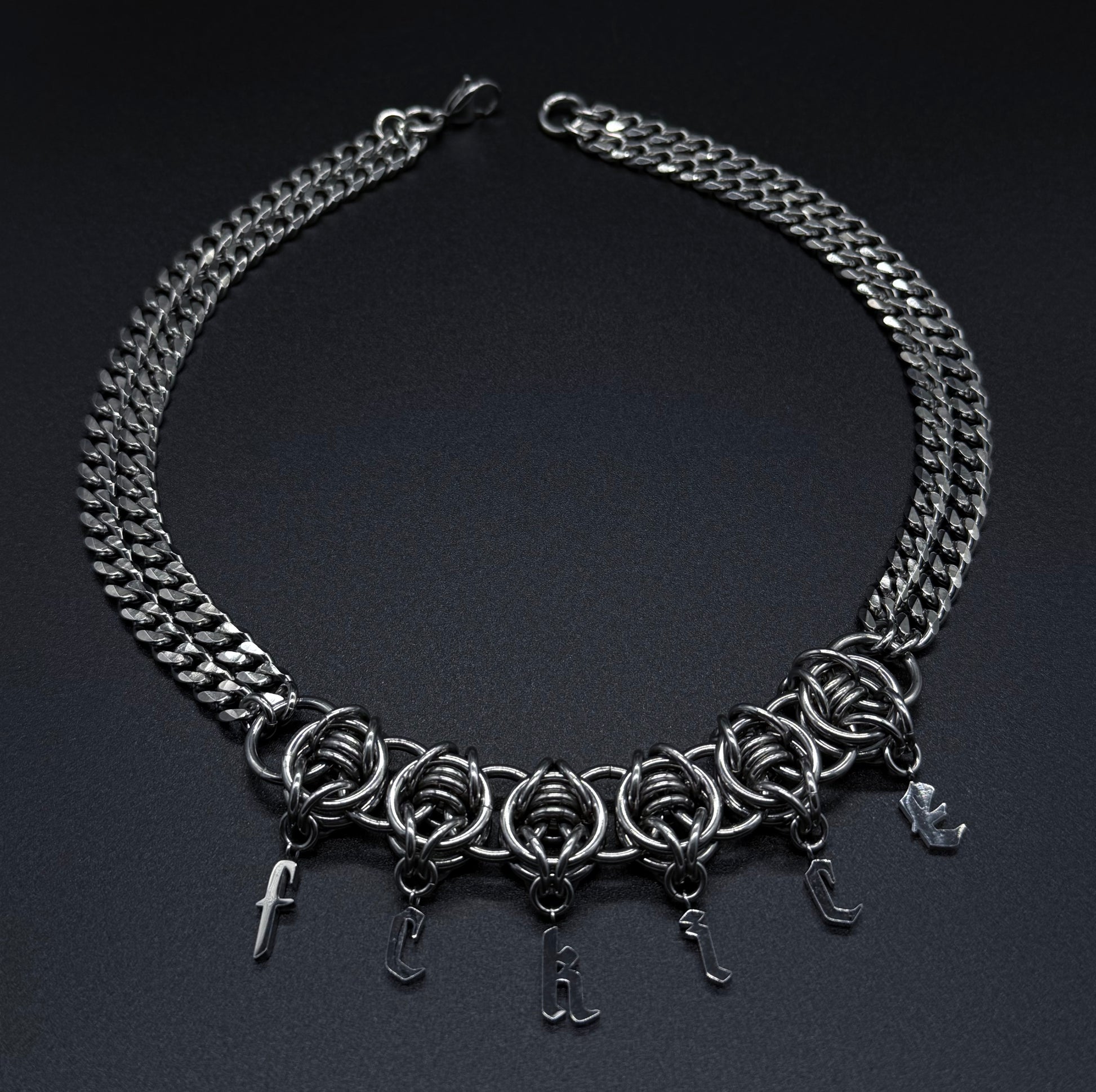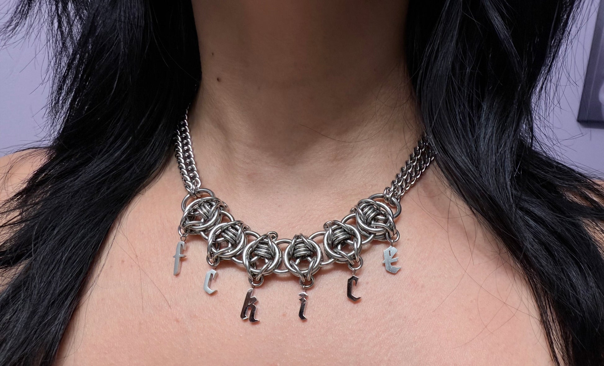 Chainmail weave with a double layer chain and the words spelling “FCK ICE”