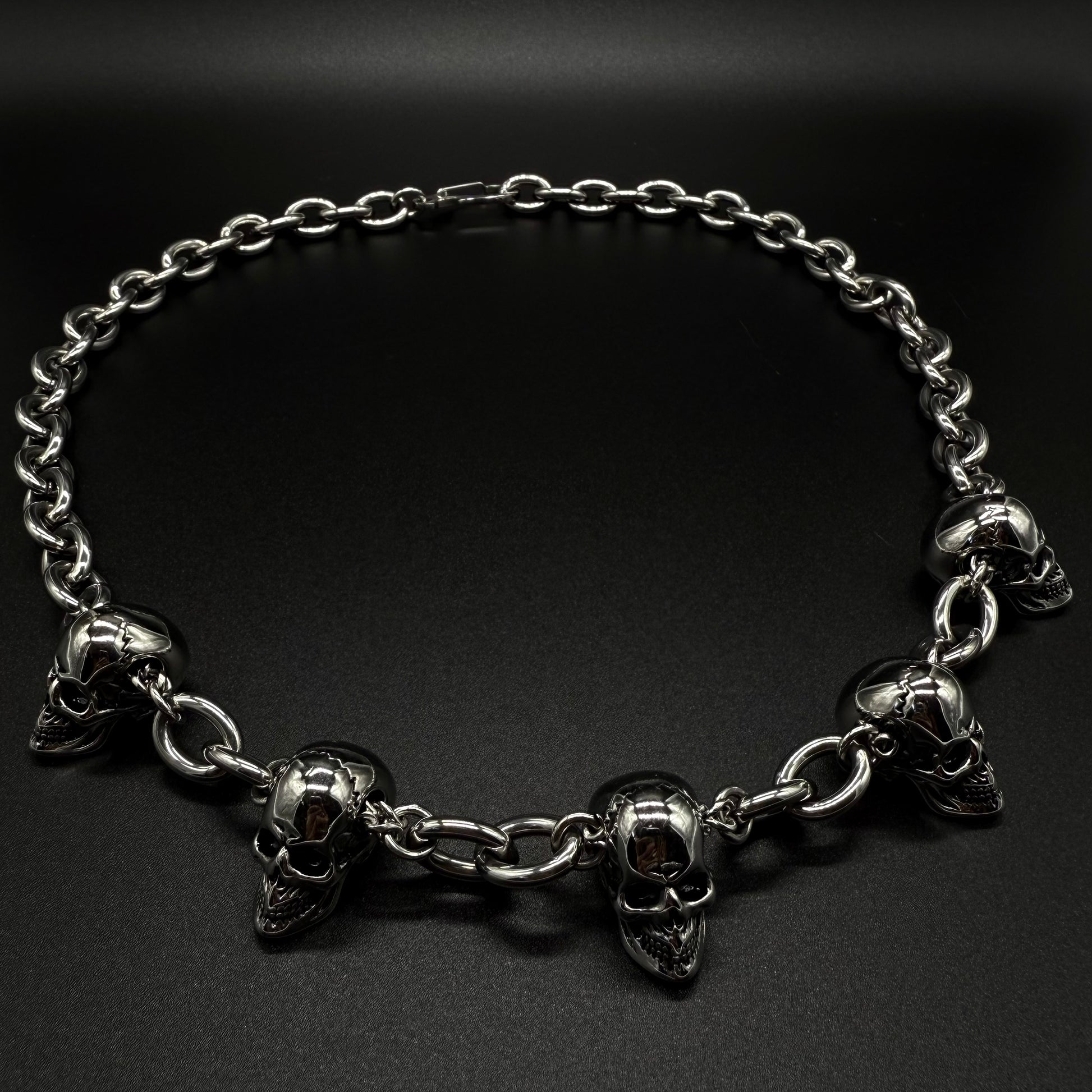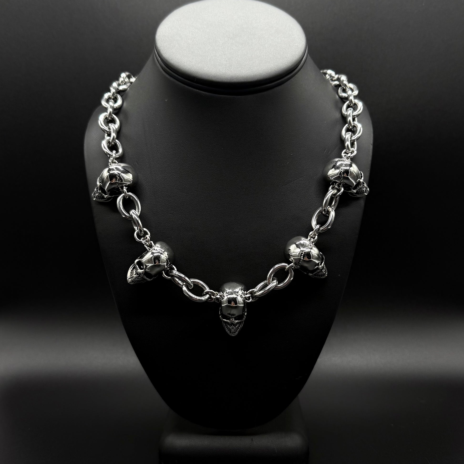 An all stainless steel cable link chain made up of 5 skull heads. This is a recreation of a necklace I had seen on Travis Barker some years ago. Each skull head has cracked details on the frontal bone.